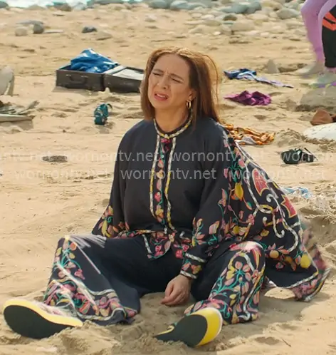 Molly Novak (played by Maya Rudolph) on Loot on Apple was spotted wearing this black printed pants and tunic on Loot on episode 'Up and Away' (3x01) in Oct 2025. Molly's Top is the Foulard Shirt in Borboni Placée Nero by La DoubleJ . Molly's Pants is the Palazzo Pants in Borboni Placée Nero by La DoubleJ . Molly's Shoes is the Shearling Slingback Platform Sandal by La DoubleJ.