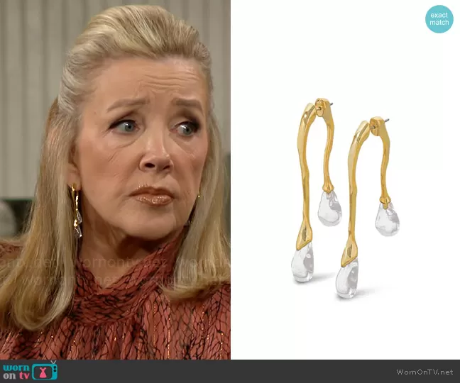 Nikki Reed Newman (played by Melody Thomas-Scott) on The Young and the Restless on CBS was spotted wearing this red blouse and navy pants jumpsuit on The Young and the Restless on May 29 2024's episode. Nikki's Jumpsuit is the Cash Jumpsuit by Black Halo . Nikki's Earrings is the Lucite Front Back Double Drop Earring in Gold by Alexis Bittar . Nikki's Bag is the Bella Croco Bag by Teddy Blake.