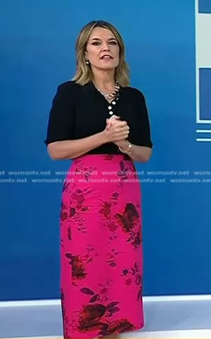 Savannah Guthrie on Today on NBC was spotted wearing this black top and pink floral pencil skirt on Today on May 30 2024's episode. Savannah's Top is the Spencer Silk Cotton Polo Top by Proenza Schouler White Label . Savannah's Skirt is the Floral-print Cotton-faille Midi Skirt by Erdem.