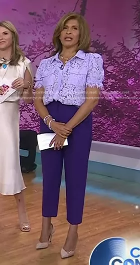 Hoda Kotb on Today on NBC was spotted wearing this lilac lace top and purple pants on Today on May 30 2024's episode. Hoda's Top is the Mina Lace Shirt in Lilac by Generation Love . Hoda's Pants is the High-Waisted Pants in Purple by Zara.