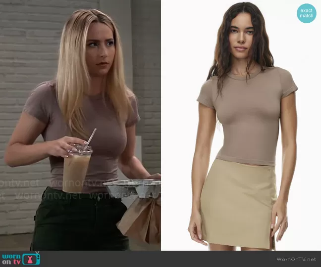 Josslyn Jacks (played by Eden McCoy) on General Hospital on ABC was spotted wearing this taupe tee on General Hospital on May 30 2024's episode. Josslyn's Top is the Sinch Smooth Willow T-Shirt in Deep Taupe by Seamless at Aritzia .