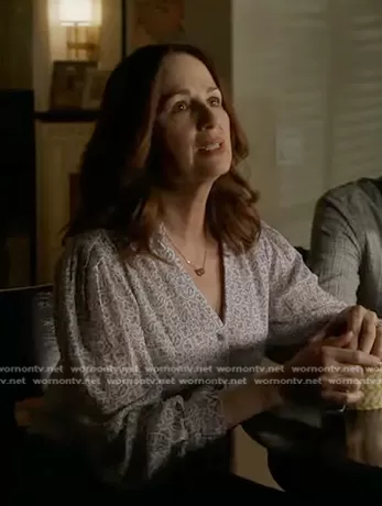 Helena Diaz (played by Paula Marshall) on 9-1-1 on Fox was spotted wearing this white paisley print blouse on 9-1-1 on episode 'All Fall Down' (7x10) in May 2024. 's Top is the Keyra Floral Print Button-Up Top in French Blue Multi by Paige.