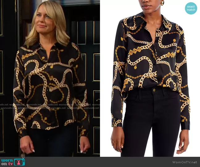 Nicole Walker (played by Arianne Zucker) on Days of our Lives on Peacock was spotted wearing this black chain print blouse on Days of our Lives on May 31 2024's episode. Nicole's Top is the Tyler Silk Shirt by L'Agence.