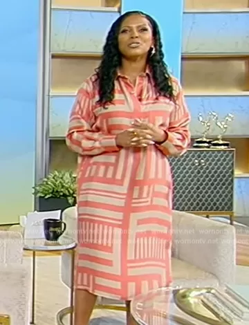 Tamron Hall on Tamron Hall Show on ABC was spotted wearing this geometric print shirtdress on Tamron Hall Show on May 31 2024's episode. Tamron's Dress is the Salmon pink printed silk dress by Fendi.