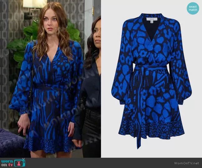 Stephanie Johnson (played by Abigail Klein) on Days of our Lives on Peacock was spotted wearing this blue printed wrap dress on Days of our Lives on Jun 01 2024's episode. Stephanie's Dress is the Kerri Dress in Blue/Navy by Reiss.