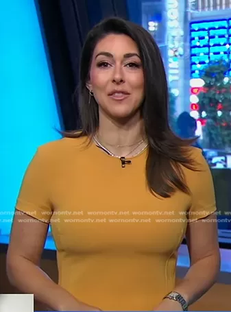 Erielle Reshef on Good Morning America on ABC was spotted wearing this mustard short sleeve dress on Good Morning America on Jun 03 2024's episode. Erielle's Dress is the Admiral Crepe Corset Tee Dress by Theory.