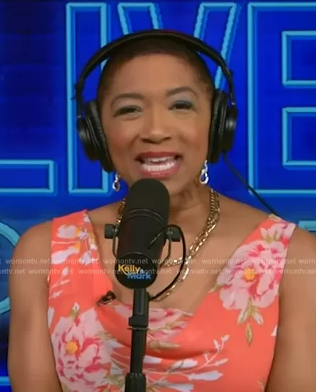 Deja Vu on Live with Kelly and Mark on Disney ABC Home Entertainment was spotted wearing this orange floral wrap dress on Live with Kelly and Mark on Jun 02 2024's episode. Deja Vu's Dress is the Handkerchief-Hem Cowl-Neck Dress by Robbie Bee.