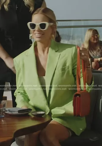 Caroline Stanbury (played by Caroline Stanbury) on The Real Housewives of Dubai on BravoTV was spotted wearing this green oversized blazer on The Real Housewives of Dubai on episode 'The V.V.I.P.' (2x01) in Jun 2024. Caroline's Jacket is the Guia Blazer in Acid Green by The Andamane . Caroline's Sneakers is the Block Sneakers with Wedge Outsole in Calfskin by Celine . Caroline's Sunglasses is the O'Lock 52MM Rectangular Sunglasses in Ivory Blue by Fendi . Caroline's Bag is the Constance 18 Gold Epsom Rose Gold Hardware by Hermes.