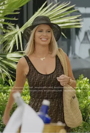 Caroline Stanbury (played by Caroline Stanbury) on The Real Housewives of Dubai on BravoTV was spotted wearing this brown logo print top and pants on The Real Housewives of Dubai on episode 'The V.V.I.P.' (2x01) in Jun 2024. Caroline's Swimsuit is the Fendirama Monogram One-Piece Swimsuit by Fendi . Caroline's Pants is the Wide Leg Pants by Fendi . Caroline's Hat is the Vlogo Signature Fedora Hat by Valentino Garavani . Caroline's Watch is the Tubogas Serpenti Watch by Bvlgari . Caroline's Bag is the Rive Gauche Shopper Bag by Saint Laurent.