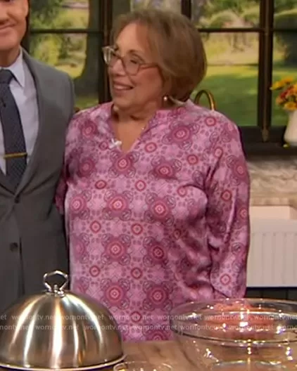 on The Drew Barrymore Show on CBS was spotted wearing this pink geometric print blouse on The Drew Barrymore Show on Jun 04 2024's episode. 's Top is the Soft Satin Charmeuse Top by Talbots.