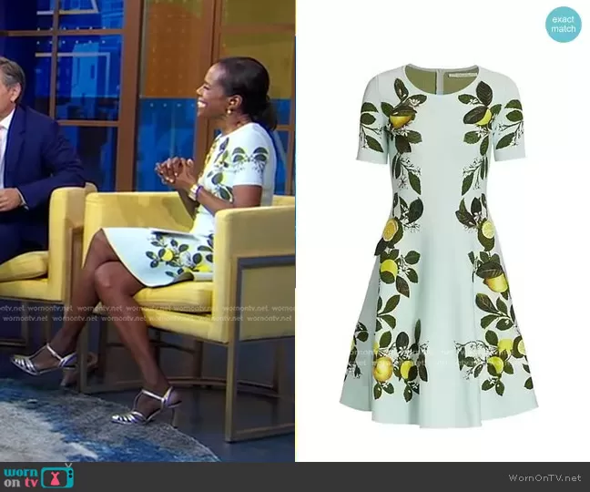 Deborah Roberts on Good Morning America on ABC was spotted wearing this Deborah’s light blue lemon dress and sandals on Good Morning America on Jun 04 2024's episode. Deborah's Dress is the Citrus Primavera Jacquard Fit-&-Flare Dress by Oscar de la Renta . Deborah's Shoes is the Claude Silver Leather T-strap Sandals by Celine.