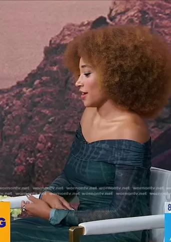 on Good Morning America on ABC was spotted wearing this green printed off-shoulder dress on Good Morning America on Jun 05 2024's episode. 's Dress is the Terra Bardot Midi Dress in Cityscape Green by Motel.