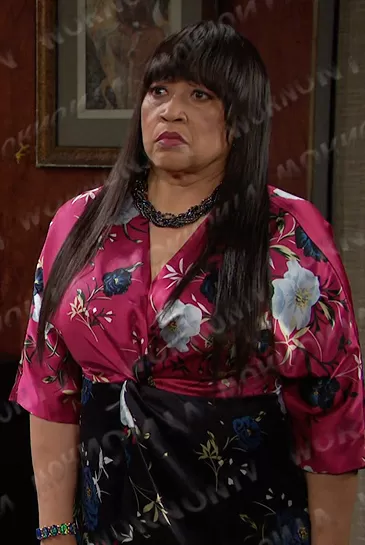 Paulina Price (played by Jackée Harry) on Days of our Lives on Peacock was spotted wearing this colorblock floral dress on Days of our Lives on May 30 2024's episode. Paulina's Dress is the Farrah Satin Floral Mid Dress by Hobbs London.