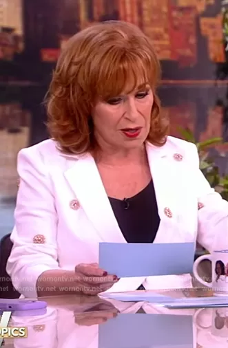 Joy Behar on The View on ABC was spotted wearing this white embellished blazer on The View on Jun 06 2024's episode. Joy's Blazer is the Khloe Ditsy Dots Embroidered Denim Blazer by Cinq a Sept.