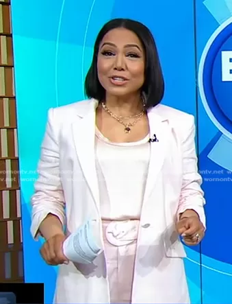 Stephanie Ramos on Good Morning America on ABC was spotted wearing this blush pink ruched sleeve blazer and shorts on Good Morning America on Jun 06 2024's episode. Stephanie's Jacket is the Kylie Linen and Cotton Blazer in Icy Pink by Cinq a Sept . Stephanie's Shorts is the Aldi Linen Blend Belted Shorts in Icy Pink by Cinq a Sept.