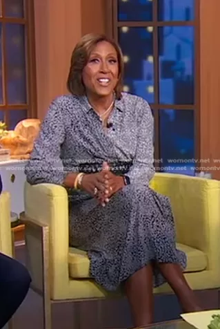 Robin Roberts on Good Morning America on ABC was spotted wearing this grey leopard shirtdress on Good Morning America on Jun 06 2024's episode. Robin's Dress is the Karen Two-Tone Draped Midi Dress by Rag & Bone . Robin's Belt is the Scalloped Leather Belt by Bcbgmaxazria.