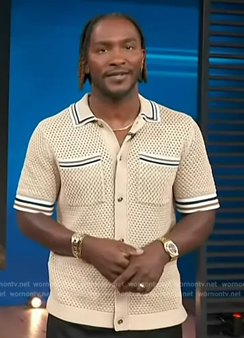 Scott Evans on Access Hollywood on NBC was spotted wearing this crochet knit shirt on Access Hollywood on Jun 06 2024's episode. Scott's Shirt is the Coulson Crochet Shirt by Reiss.