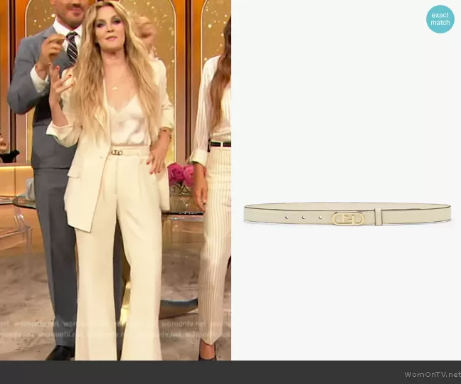 Drew Barrymore on The Drew Barrymore Show on CBS was spotted wearing this white belt on The Drew Barrymore Show on Jun 07 2024's episode. Drew's Belt is the Logo Belt by Fendi.