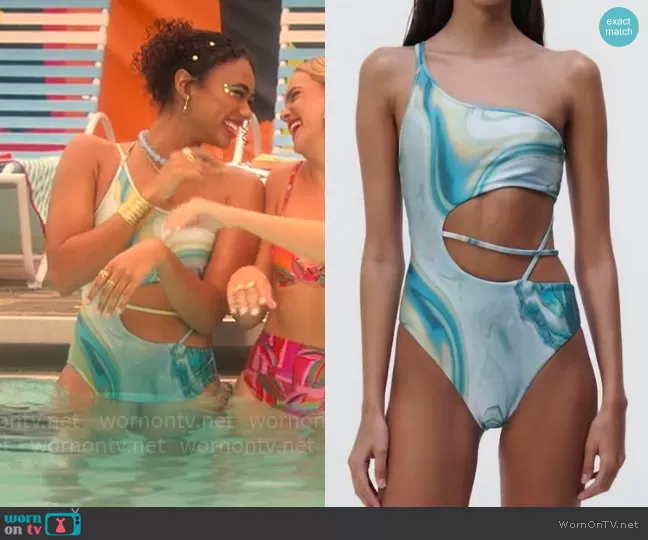 Tabitha 'Tabby' Hayworth (played by Chandler Kinney) on Pretty Little Liars Original Sin on HBO was spotted wearing this pride pool party outfit on Pretty Little Liars Original Sin on episode 'Chapter Sixteen: Hell House' (2x06) in Jun 2024. Tabby's Swimsuit is the Stormi Swimsuit in Laguna Marble by Simkhai.