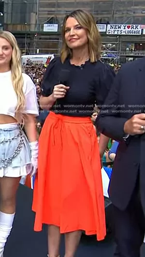 Savannah Guthrie on Today on NBC was spotted wearing this navy smocked top and midi skirt on Today on Jun 07 2024's episode. Savannah's Top is the Langston Top by Veronica Beard . Savannah's Skirt is the Drawstring Midi Skirt in Wild Strawberry by Essentiel Antwerp.