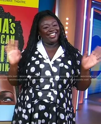 on Good Morning America on ABC was spotted wearing this black polka dot dress on Good Morning America on Jun 07 2024's episode. 's Dress is the Short-Sleeve Mini Polka Dot Dress by Plenty by Tracy Reese.