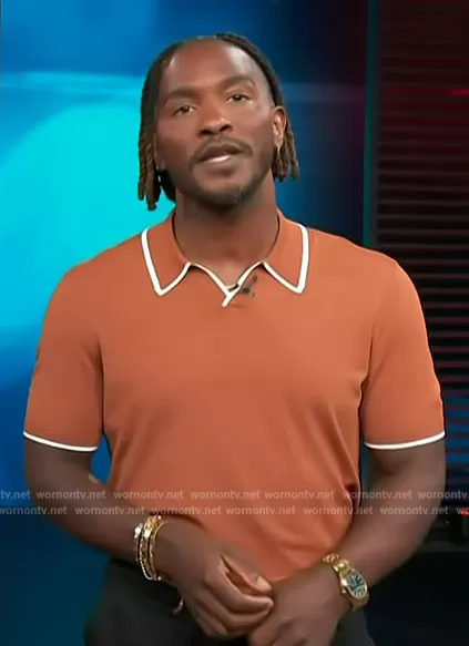 Scott Evans on Access Hollywood on NBC was spotted wearing this orange ripped polo on Access Hollywood on episode 'Legacy' (6x13) in Jun 2024. Scott's Shirt is the Stortfo Stretch Polo by Ted Baker.
