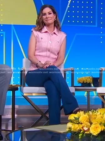 Rebecca Jarvis on Good Morning America on ABC was spotted wearing this pink tweed sleeveless top and blue flare pants on Good Morning America on Jun 10 2024's episode. Rebecca's Jacket is the Sleeveless Tweed Jacket by Maje . Rebecca's Pants is the Royce Stretch Cotton Pants by Veronica Beard.