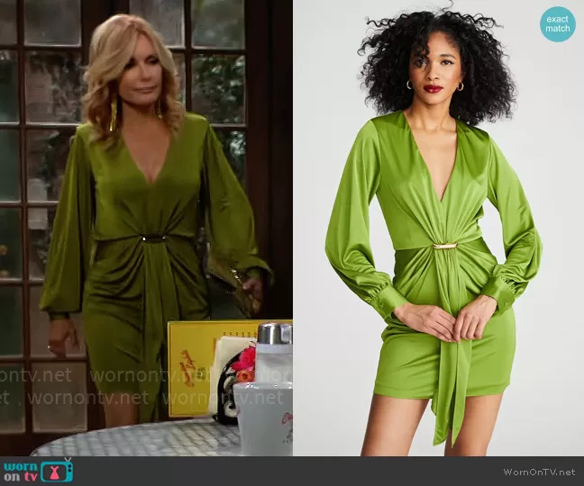 Lauren Fenmore (played by Tracey Bregman) on The Young and the Restless on CBS was spotted wearing this green drape front dress on The Young and the Restless on Jun 11 2024's episode. Lauren's Dress is the Tully Dress in Jungle by Halston .