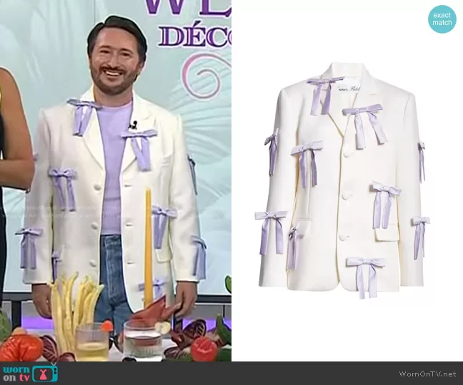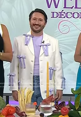 on Today on NBC was spotted wearing this white bow blazer on Today on Jun 11 2024's episode. 's Jacket is the Gender Inclusive Walt Bow Blazer in Ivory/ Lavender by Tanner Fletcher.
