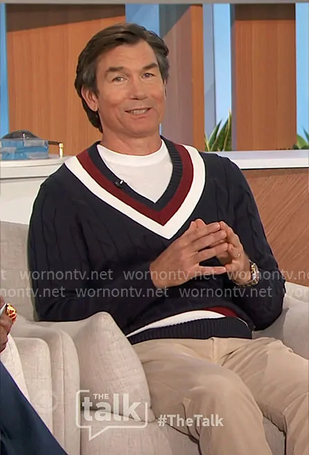 Jerry O'Connell on The Talk on CBS was spotted wearing this navy sweater with striped trim on The Talk on Sep 13 2024's episode. Jerry's Sweater is the Vintage-Inspired Tennis V-Neck Sweater in Supima® Cotton by Brooks Brothers.
