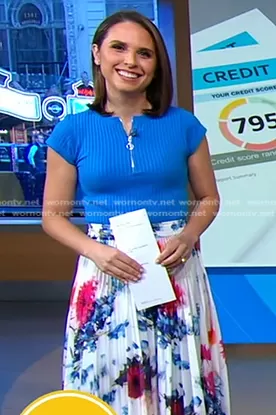 Elizabeth Schulze on Good Morning America on ABC was spotted wearing this blue ribbed top and floral pleated skirt on Good Morning America on Jun 11 2024's episode. Elizabeth's Top is the Seamless Zippered Top in Blue by Zara . Elizabeth's Skirt is the Elasticated Slip Pleat Skirt by Club Monaco.