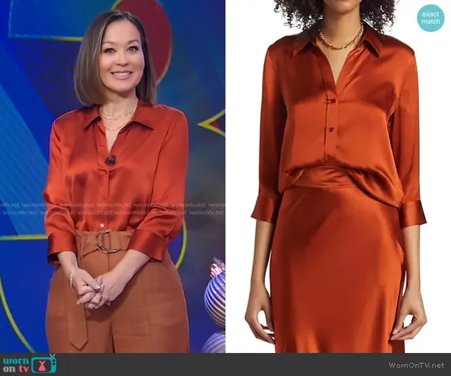 Eva Pilgrim on Good Morning America on ABC was spotted wearing this orange satin shirt and brown belted pants on Good Morning America on Dec 03 2024's episode. Eva's Top is the Dani Silk Charmeuse Blouse in Sienna by L'Agence . Eva's Pants is the Sunny Belted Pants by Veronica Beard.