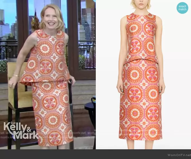 on Live with Kelly and Mark on Disney ABC Home Entertainment was spotted wearing this orange motif print top and skirt on Live with Kelly and Mark on Jun 12 2024's episode. 's Top is the La Scala trapeze blouse by La DoubleJ . 's Skirt is the Pencil Skirt by La DoubleJ.