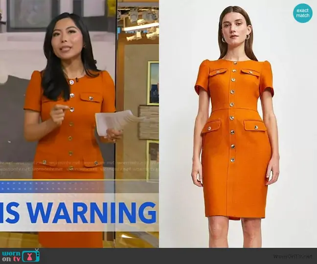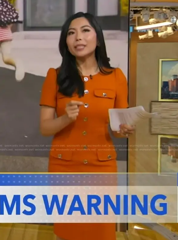 on Good Morning America on ABC was spotted wearing this orange button front sheath dress on Good Morning America on Aug 27 2025's episode. 's Dress is the Tailored Short Sleeve Utility Pencil Midi Dress in Orange by Karen Millen.