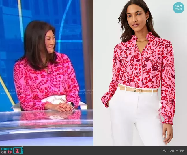 Juju Chang on Good Morning America on ABC was spotted wearing this pink floral blouse on Good Morning America on Mar 12 2026's episode. Juju's Top is the Floral Ruffle Button Top in Peppermint Stick by Ann Taylor.
