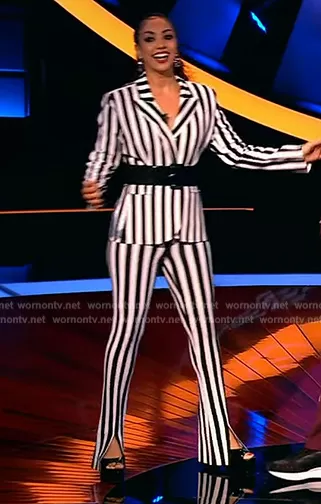 Corinne Foxx on Beat Shazam on FOX was spotted wearing this stripe blazer and pants on Beat Shazam on Jun 11 2024's episode. Corinne's Blazer is the Stripe Blazer by Dolce & Gabbana . Corinne's Pants is the Stripe Pants by Dolce & Gabbana.