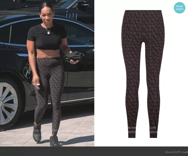 (played by Malika) on The Kardashians on Hulu was spotted wearing this black logo leggings on The Kardashians on episode 'I'm the Man of the Year!' (5x04) in Jun 2024. 's Leggings is the V Logo Leggings by Valentino.