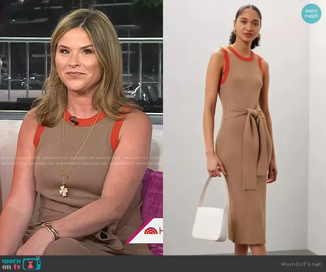 Jenna Bush Hager on Today on NBC was spotted wearing this beige sleeveless knit dress on Today on Jun 13 2024's episode. Jenna's Dress is the Colorblocked Midi Dress by Toccin.