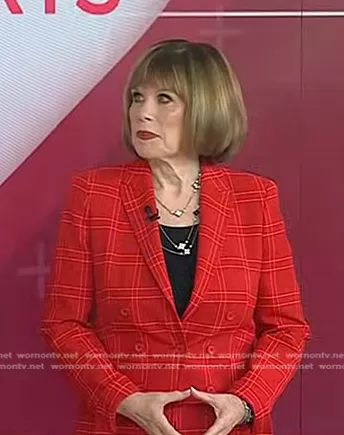 on Today on NBC was spotted wearing this red plaid double breasted blazer on Today on Jun 14 2024's episode. 's Jacket is the Windowpane Plaid Faux Double Breasted Blazer by Akris Punto.