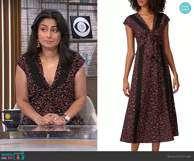 Dr. Celine Gounder on CBS Mornings on CBS was spotted wearing this red floral print dress with lace insets on CBS Mornings on Jun 14 2024's episode. Celine's Dress is the Paisley Tie Front Dress by Thakoon Collective .