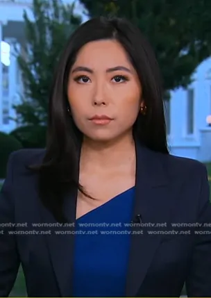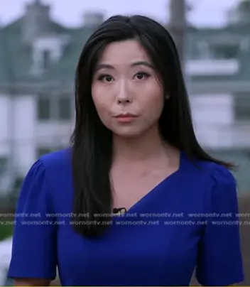 on Good Morning America on ABC was spotted wearing this blue asymmetric neck dress on Good Morning America on Sep 03 2024's episode. 's Dress is the Ruth Asymmetric Neck Midi Dress in cobalt by Dress the Population.