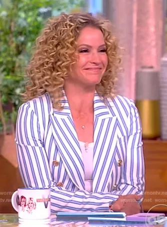 Sara Haines on The View on ABC was spotted wearing this blue stripe suit on The View on Jun 17 2024's episode. Sara's Blazer is the Kylie Striped Double-Breasted Cutaway Blazer by Toccin . Sara's Pants is the Eden Cigarette Striped Pants by Toccin.