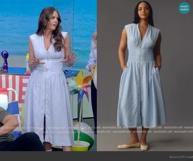 on Live with Kelly and Mark on Disney ABC Home Entertainment was spotted wearing this blue smocked waist dress on Live with Kelly and Mark on Jun 17 2024's episode. 's Dress is the The Tommie Cap Sleeve Smocked Shirt Dress by Anthropologie.