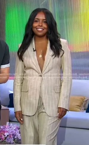 on Good Morning America on ABC was spotted wearing this beige pinstripe blazer and pant suit on Good Morning America on Jun 17 2024's episode. 's Jacket is the Regular-Fit Jacket in Pinstripe Material with Signature Lining by Boss . 's Pants is the Pinstriped Wide-Leg Trousers by Boss.