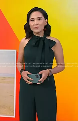 Vicky Nguyen on Today on NBC was spotted wearing this green tie neck jumpsuit on Today on Jun 18 2024's episode. Vicky's Jumpsuit is the Bow Neck Stretch Crepe Jumpsuit by Vince Camuto.