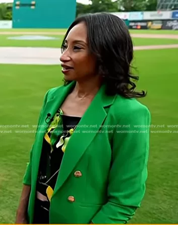 on Today on NBC was spotted wearing this green blazer on Today on Jun 18 2024's episode. 's Jacket is the Faux Double-Breasted Ruched-Sleeve Blazer in Green Chili by Bar III.