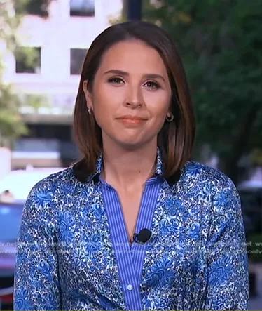 Elizabeth Schulze on Good Morning America on ABC was spotted wearing this blue floral dress on Good Morning America on Jun 18 2024's episode. Elizabeth's Dress is the Floral Print Midi Dress by Sandro.