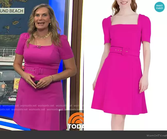 Emily West on Today on NBC was spotted wearing this pink belted dress on Today on Jun 19 2024's episode. Emily's Dress is the Square Neck Belted Fit & Flare Dress by Donna Ricco.