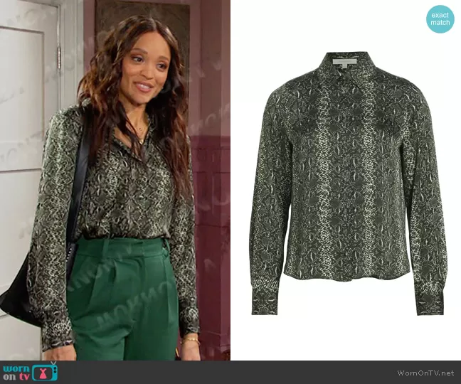 Lani Price (played by Sal Stowers) on Days of our Lives on Peacock was spotted wearing this green snakeskin print shirt on Days of our Lives on Jun 20 2024's episode. Lani's Top is the The Take Me Seriously Top in Serpiente by Favorite Daughter.