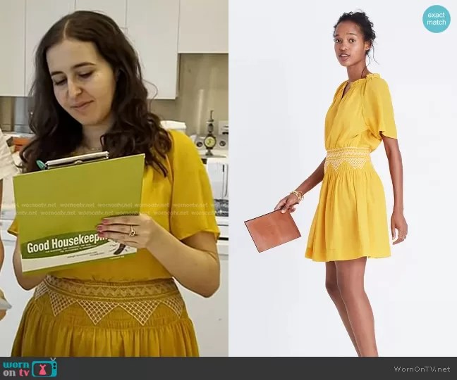 on Today on NBC was spotted wearing this yellow embroidered dress on Today on Jun 20 2024's episode. 's Dress is the Smocked Mini Dress in Golden Ochre by Madewell.